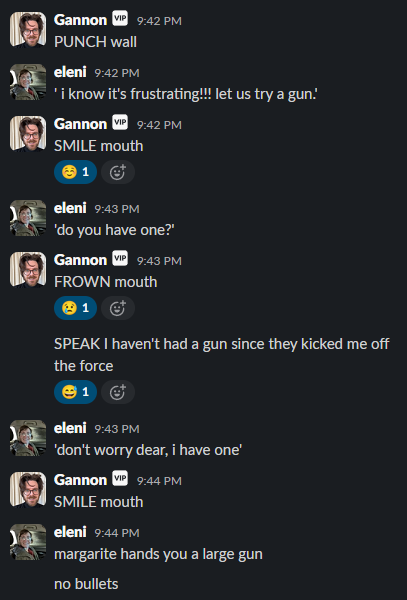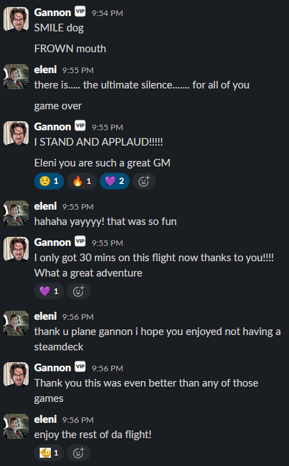 If you are reading this it means you have stumbled upon Eleni & Gannon’s text based roleplaying game from Dec 2025 that Eleni ran for Gannon while he was on a flight from CA to IL. Enjoy!
